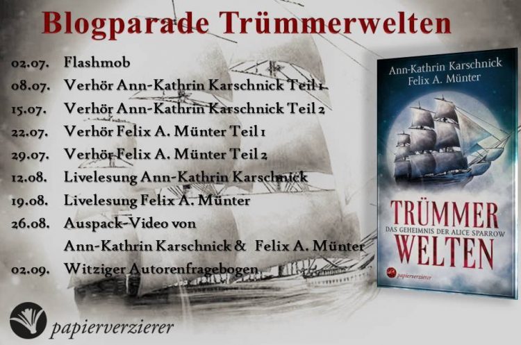 Nach dem unsere Kollegen Ann-Kathrin Karschnick auf den Zahn gefühlt haben, war nun auch der zweite Part des Autorenduo von Trümmerwelten dran. Wir haben Felix A. Münter ein wenig ausgequetscht und haben uns mit ihm in den Räumen des Papierverzierer Verlag verabredet. Den ersten Teil über anfänglich Zweifel, Rosa Schreibwolken und Mordgedanken gab es ja schon letzte Woche. Hier könnt ihr ihn noch einmal nachlesen: Verhör Teil 1 Felix A. Münter