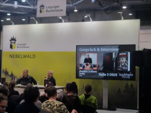 Danach hatte ich noch etwas Zeit und bin spontan bei einem Gesprächsinterview mit Stephen Graham Jones gelandet, der sein Buch Buffalo Hunter Hunter vorgestellt hat.